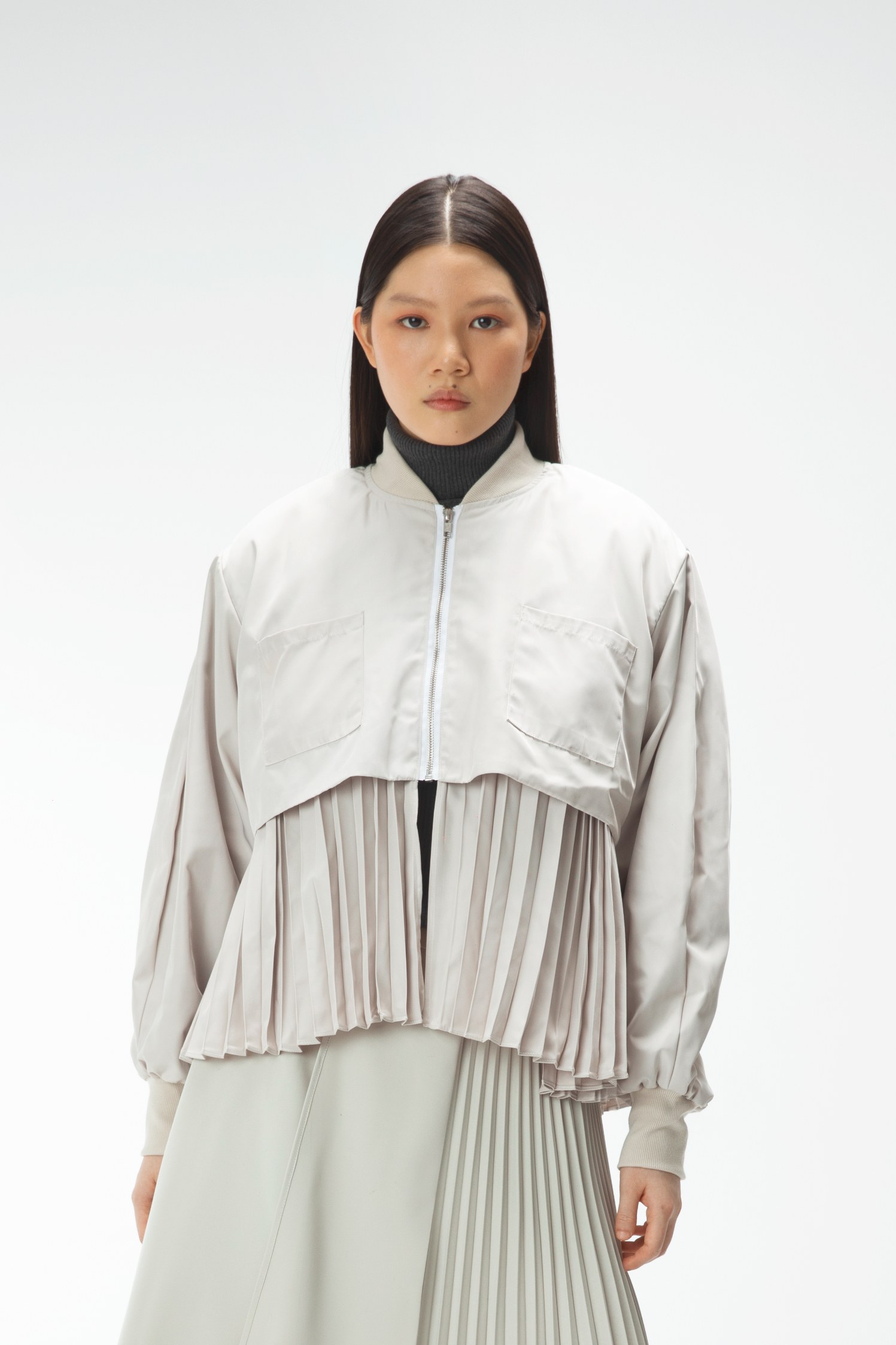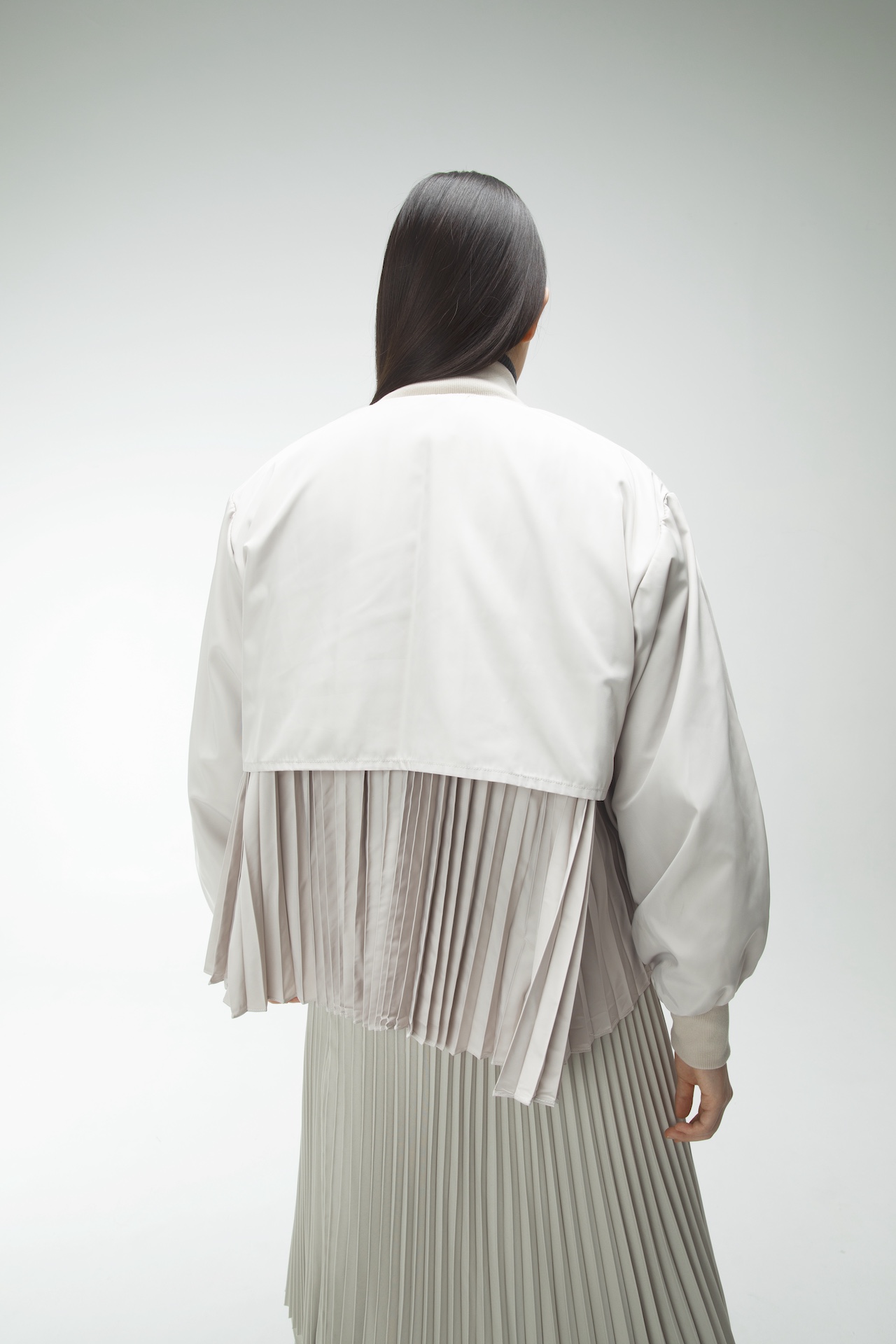 LOOSE FIT BOMBER JACKET WITH CROPPED OVERLAY & PLEATED PANELS AT THE FRONT & BACK.