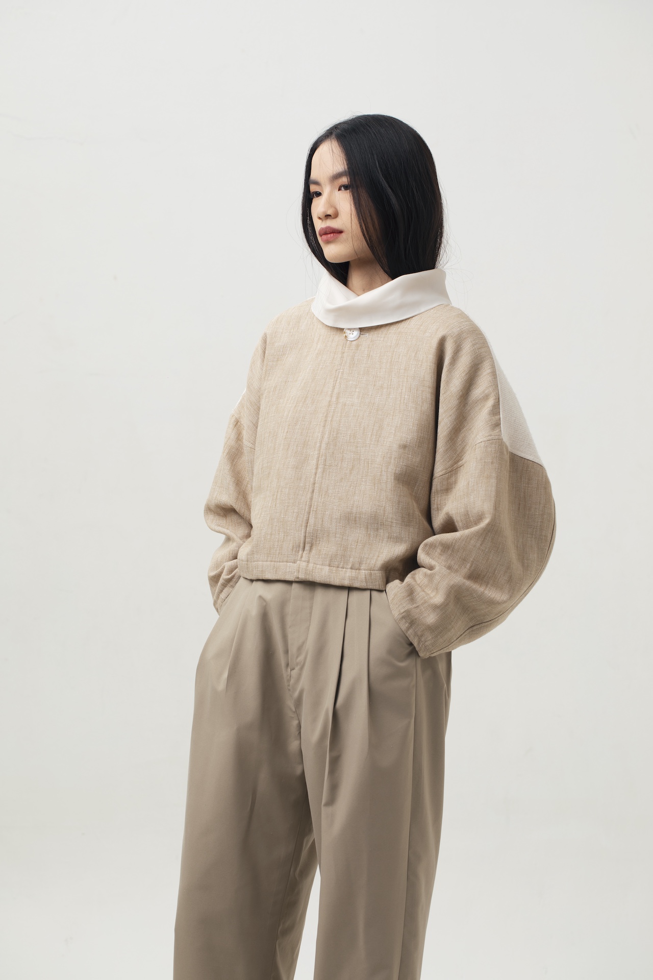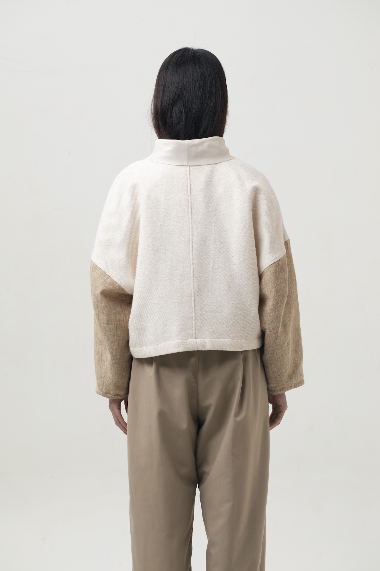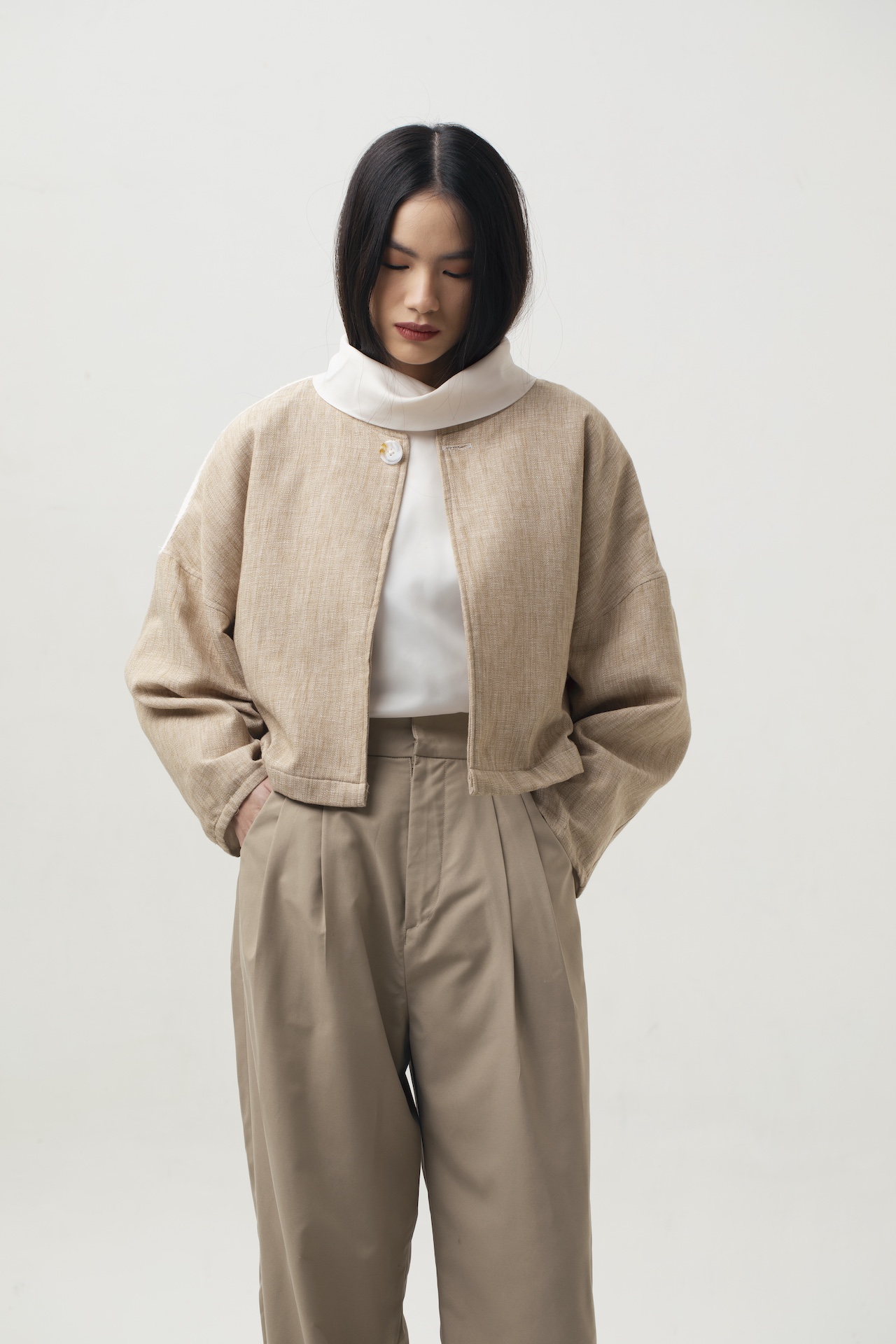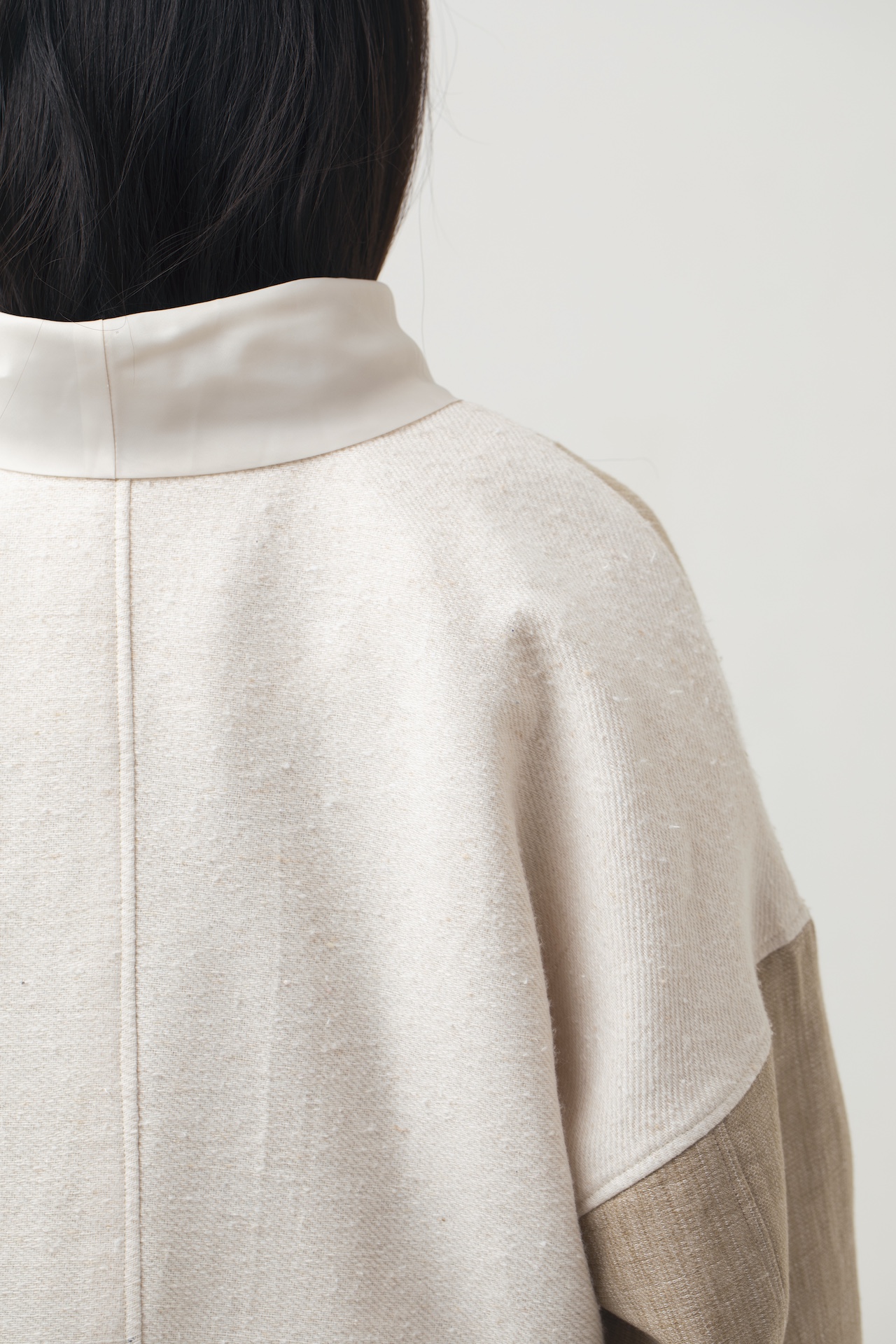 Inspired by evolving plastic waste into fabrics. The two-toned outer in off-white and beige combines 60% recycled plastic and 40% natural linen. It features an oversized silhouette, a one-button detail, and is soft and comfortable for everyday use.