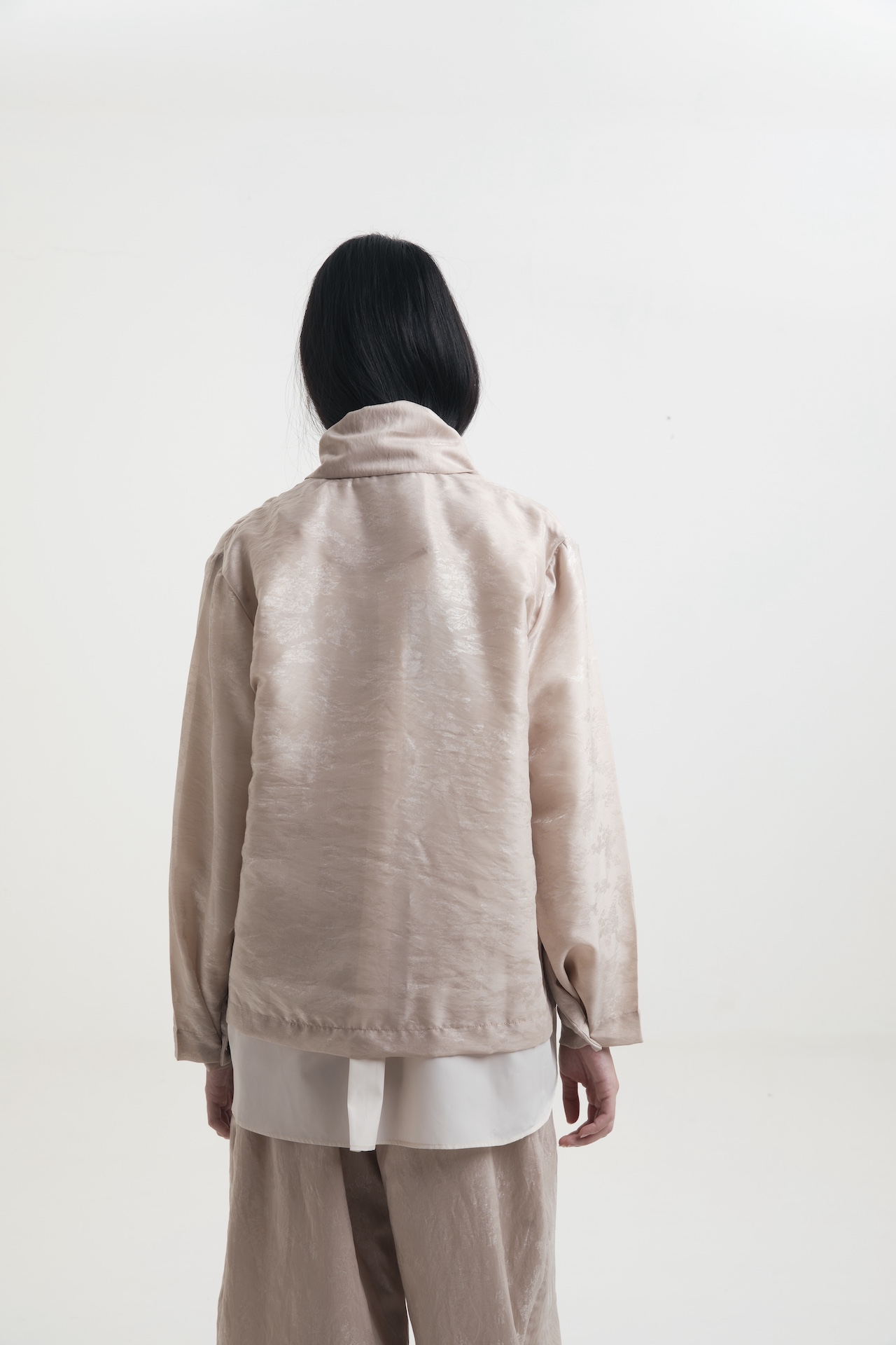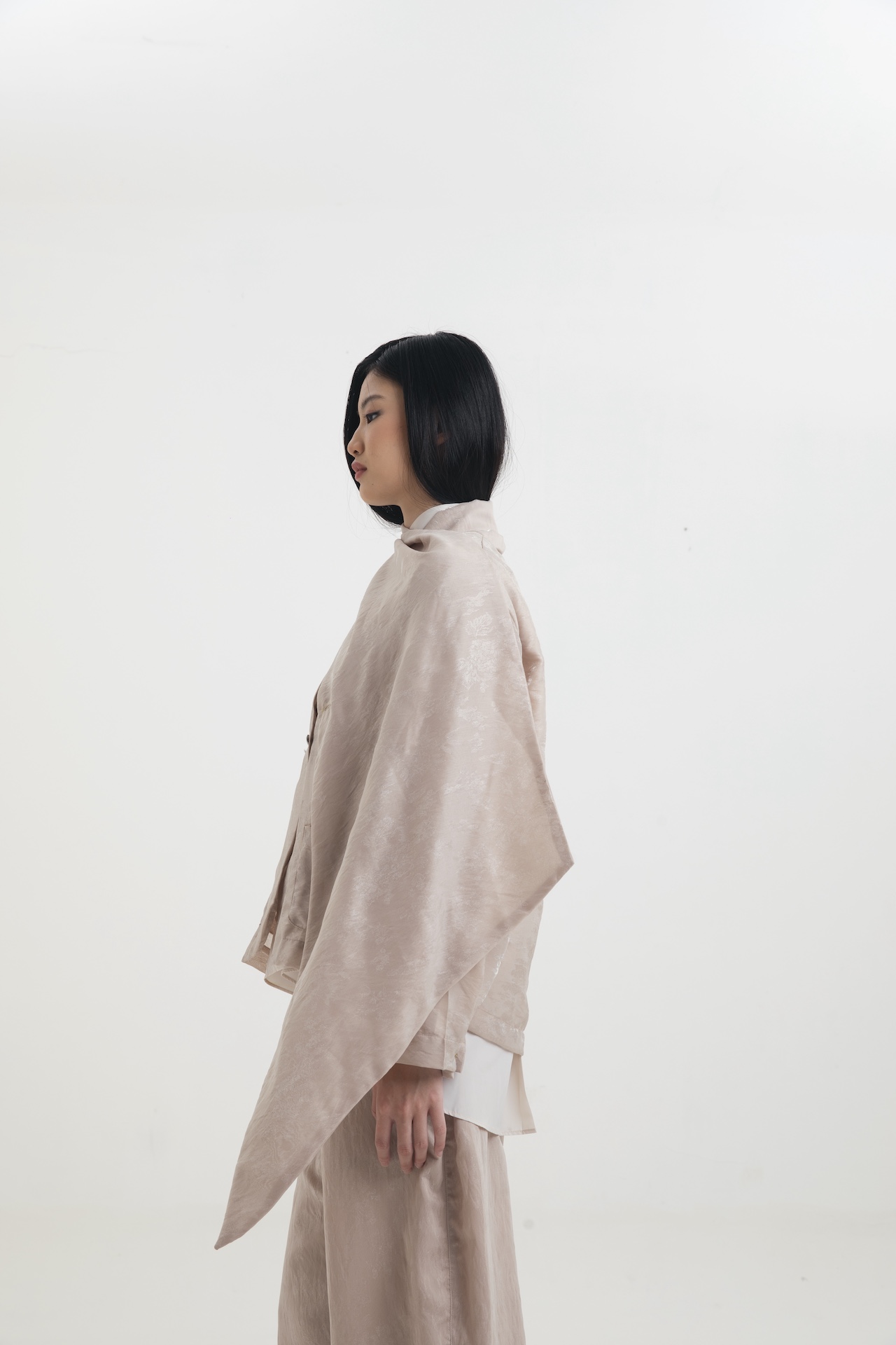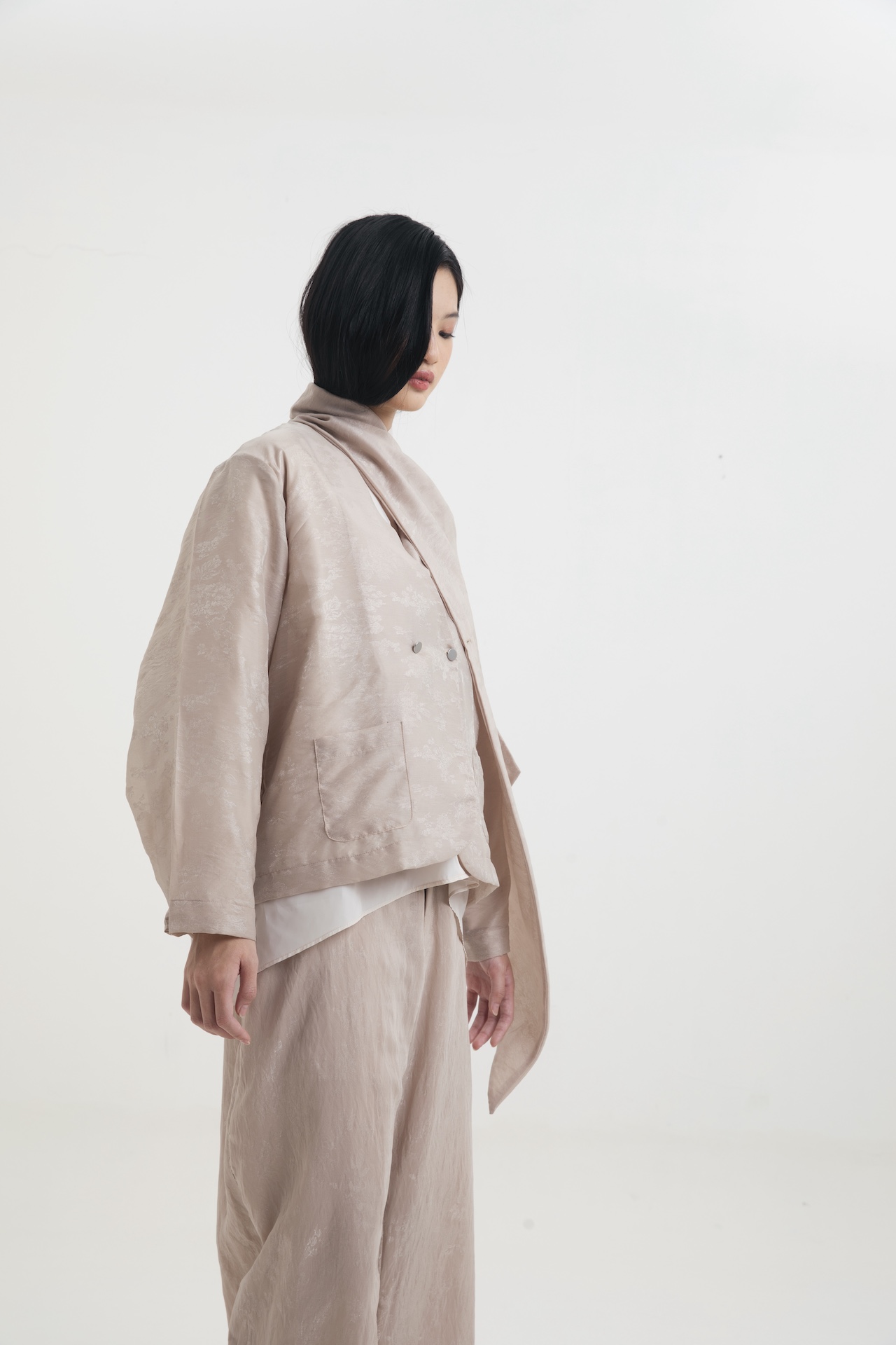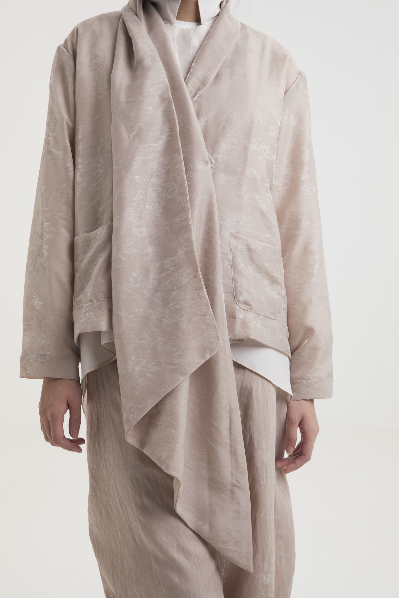 A softly tailored silhouette in lightweight sheer fabric. Featuring a distinctive asymmetrical scarf detail that elegantly drapes across the front & back.