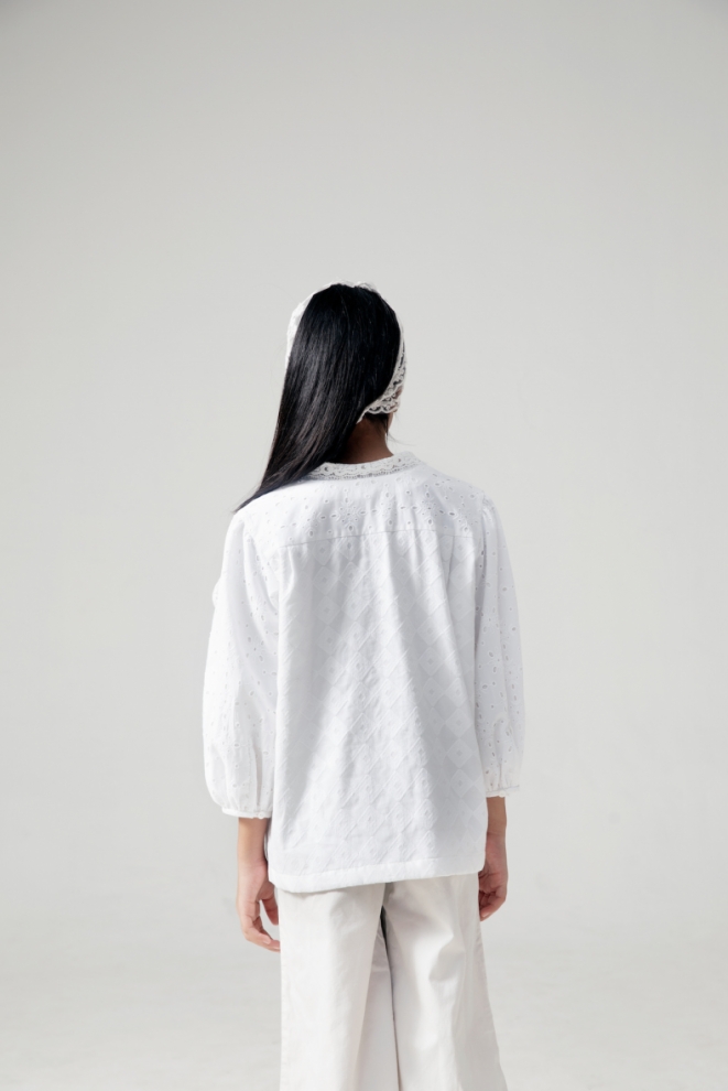 Front Button Openings, Short Sleeve, Open Shirt Collar, Eyelet Details, Lace Trimmings, Lace Front Patch Pockets, Lined
